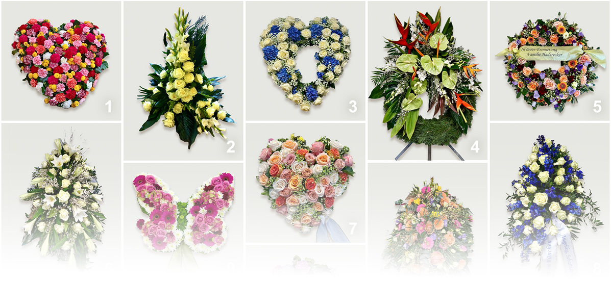 Unsere große Auswahl an Gestecken kann individuell angepasst werden und lässt sich anhand der Nummerierung auswählen.